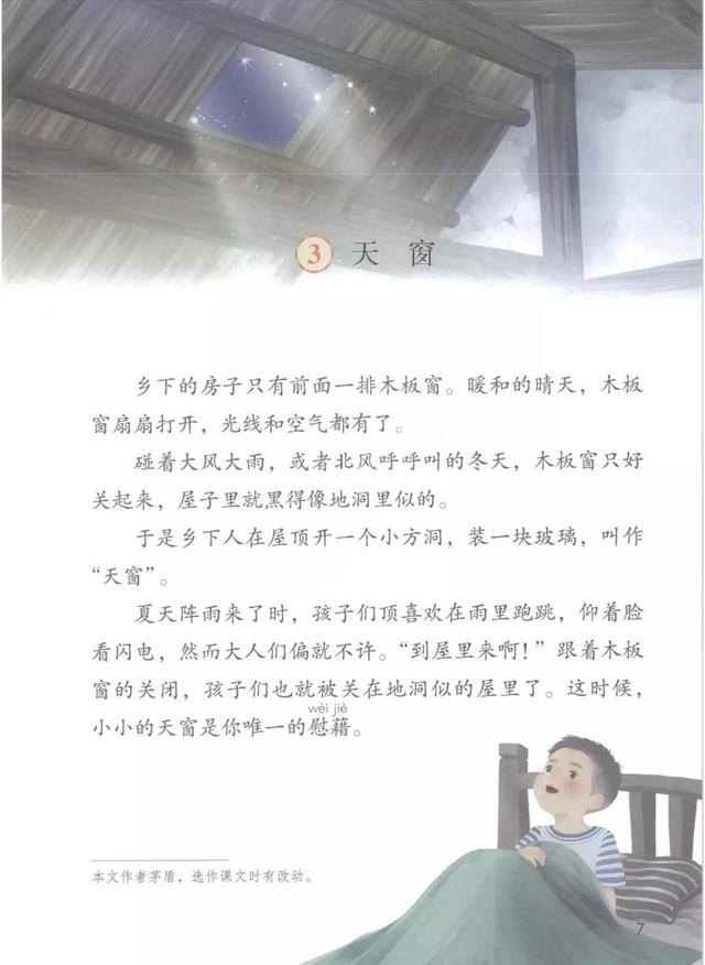 《天窗》是我国现代著名作家茅盾写的一篇抒情散文。课文描写的是乡下的房子只有前面一排木板窗,夏日里下雨,夜晚孩子们被逼着去睡觉时,所有的木板窗都关闭起来,屋子里黑洞洞的,这时候,屋顶上小小的天窗便成了孩子们唯一的慰藉,透过小小的天窗看到的点点画面,听到的点点声音,都能使孩子们的想象丰富起来,这小小的天窗便成了心灵飞翔的窗户。表达了孩子们对大自然奥秘的向往与追求,表现了其丰富的想象力和创造力。