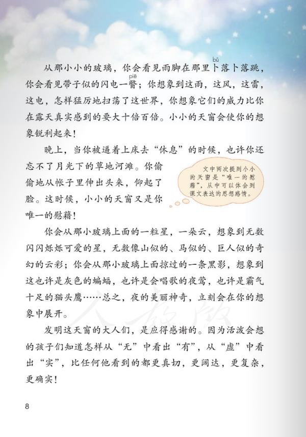 课文中“想象”部分是重点,我让学生认真读文,然后观察书中插图,请同学说说插图展示的是课文中第几自然段的内容。接着提问:“文中介绍作者透过天窗看到些什么?想象到什么?”学生回答后,我让学生思考、讨论:“除了文中介绍的,透过天窗,你还可以看到哪些景物,由此你能想象到些什么?”学生兴味盎然,有的学生说出自己的想象 这样学生很快就理解了课文,明白了文中重点句子“他看到的更真切,更阔达,更复杂,更确实!”的含义。同时还加深了学生对《天窗》的喜爱之情。