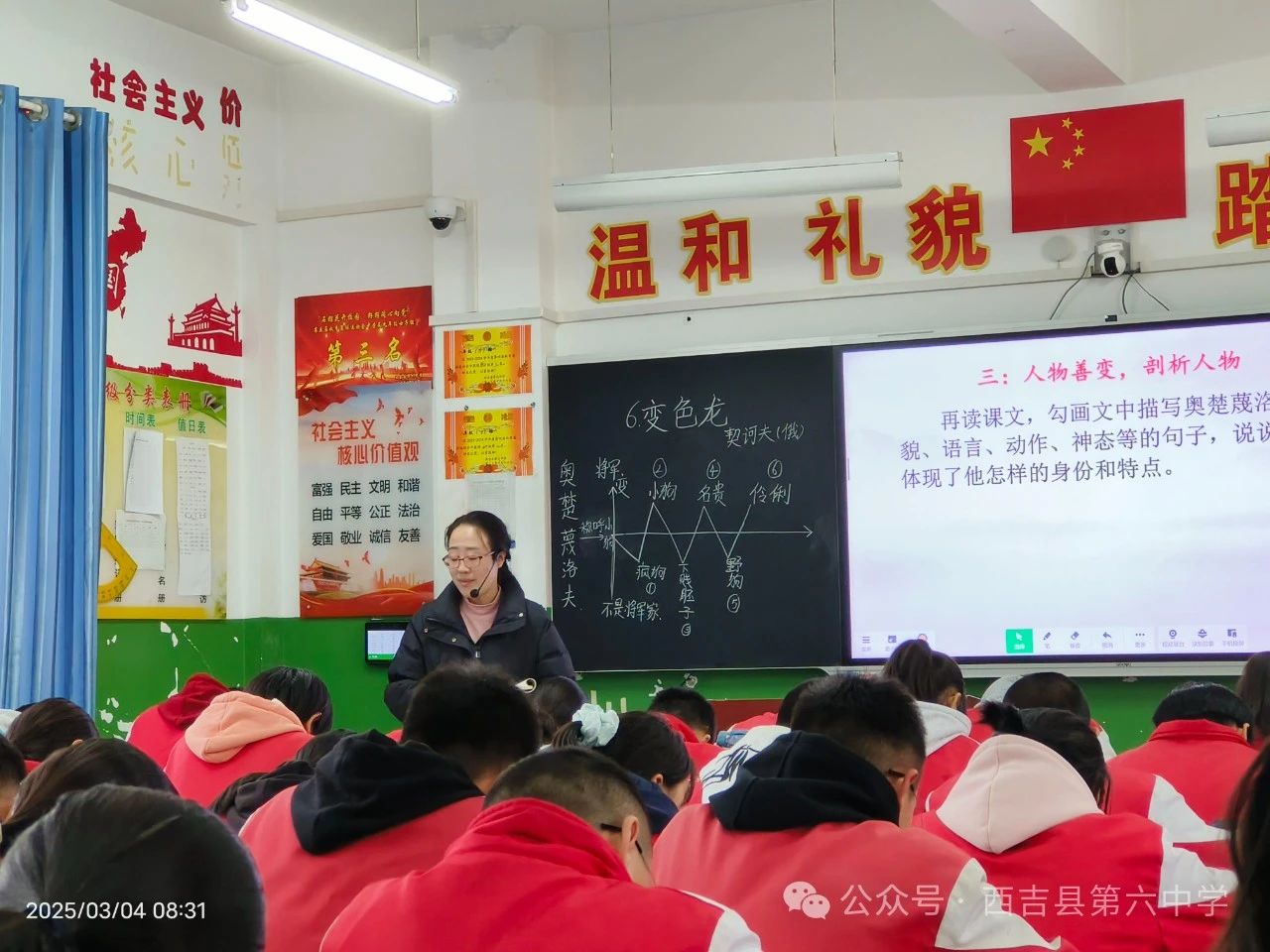 3月4日上午第一节课,赵亚琼老师的校内公开课——《变色龙》如期举行。《变色龙》是俄国作家契诃夫的短篇小说。赵老师立足文本,引导学生从小说情节、人物形象等方面进行了学习。学生带着问题走进文本,整节课的教学,师生紧扣“变”字展开讨论、探究。赵老师的精湛的授课技艺和丰厚的教师底蕴让课堂如春风徐徐,万物悄然生长。