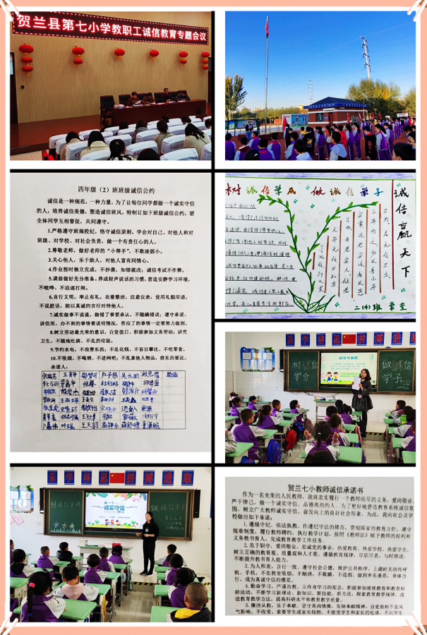学校首先利用升旗仪式和红领巾广播对全校师生发出了“树诚信学风,做诚信公民”的倡议,要求全体师生遵纪守法、真诚待人、言行一致、学会负责。同时,学校组织召开贺兰七小教职工诚信教育专题会议,并当场签订了《教师诚信承诺书》,要求全体教师率先垂范,做到“言必行,行必果”,知行统一。接着,各中队开展了“树诚信学风,做诚信学子”主题队会,并以班级为单位,制定了“班级诚信公约”,要求全班学生签名,并遵照执行,牢固树立“一处失信、处处受阻”的意识。为进一步做好主题教育工作,各中队辅导员还组织指导学生分享诚信小故事、制作主题手抄报、撰写征文……使重信誉、讲诚信的要求深入人心。