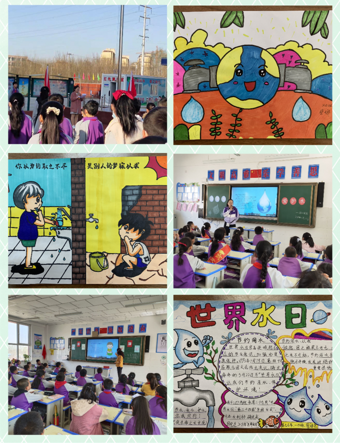 3月25日上午,二(6)中队辅导员魏欣欣面向全体师生做了以《节约用水,从我做起》为主题的国旗下讲话,呼吁全体师生珍惜水资源,爱护水环境,为建设美好家园而共同努力。随后各中队积极召开主题队会,各中队辅导员通过图片、视频等方式为同学们进行了生动地讲解,使同学们认识到保护水资源的重要性,增强了学生热爱水、珍惜水、节约水、保护水的意识。课下同学们还通过“小手拉大手”的方式和家长一起学习节水宣传知识、分享节水妙招、一起绘制节水知识手抄报、宣传画,制作爱心卡、撰写节水征文、云校家活动广场发表节水感言等让学生通过自己的言行带动家庭、带动身边的人一起加入到保护和节约水资源的行列中来。在本次节水活动周期间,我们的老师也热情地投入到节水行列里,有挥毫泼墨的、有潜心作画的、有动手制作的还有抒发情感写作的,各个施展才能,为学生和家长做好节水的表率。另外,为了扩大本次活动的辐射面,我校除了利用电子屏循环播放节水标语外,还通过微信、QQ群和公众号向家长宣传节水知识,引导广大师生和家长充分认识节约用水工作的重要意义,努力将节约用水工作变为每个人的自觉行动,充分形成教育合力,使节水活动真正落到实处。