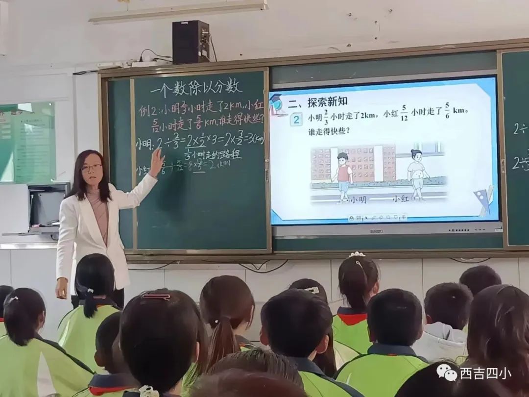 六年级数学备课组单桂花老师执教《分数除以整数》。在教学过程中,单老师从学生已有知识经验为出发点,让学生通过旧知迁移、折一折、涂一涂、算一算,直观的操作为主线,突破教学重难点,然后让学生展示汇报,在交流中理解分数除以整数的算理,引导学生总结分数除以整数的算法。