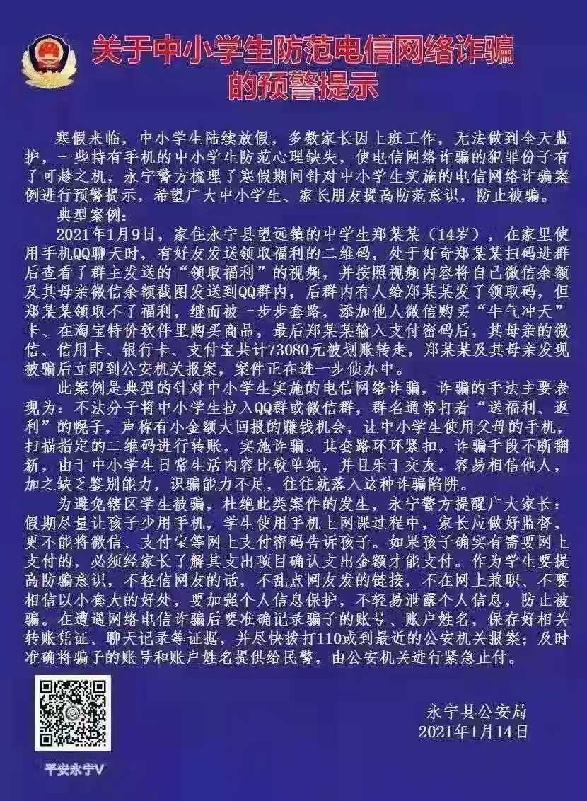 关于中小学生防范电信网络诈骗的预警提示