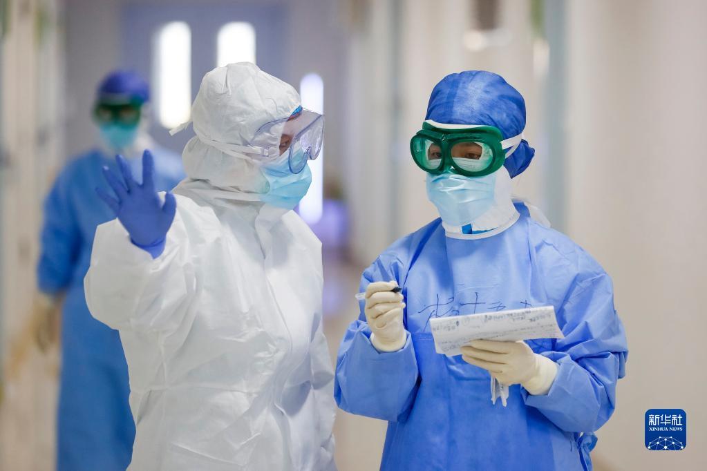 在武汉市金银潭医院的一个病区,金银潭医院护士与浙江省人民医院护士(右)交接工作(2020年3月18日摄)。新华社记者 沈伯韩 摄