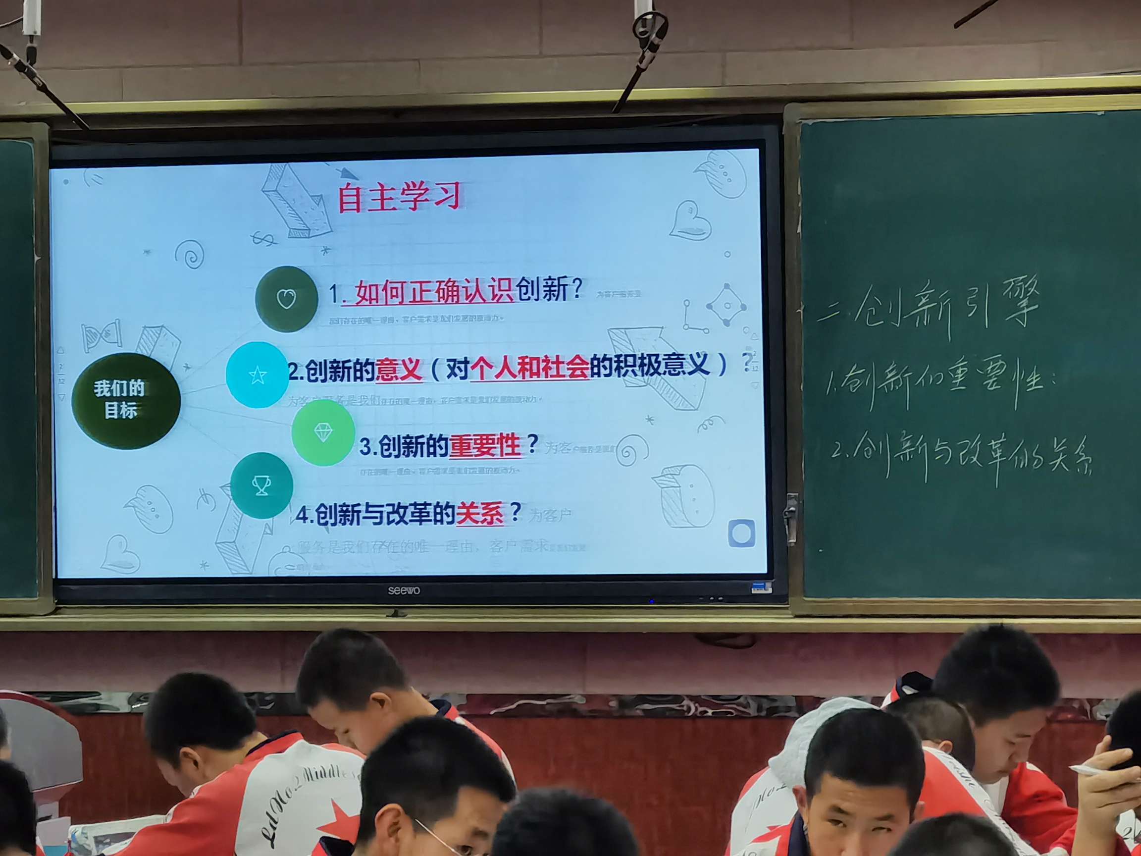 课上,教师悉心指导,学生自主学习,积极探讨,正确认识创新,探究创新的重要性,体会创新让生活更美好,培养学生学科素养和政治认同,发散思维,培养学生创新能力和家国情怀,积极为建设创新型国家,实现中华民族的伟大复兴添砖加瓦。
