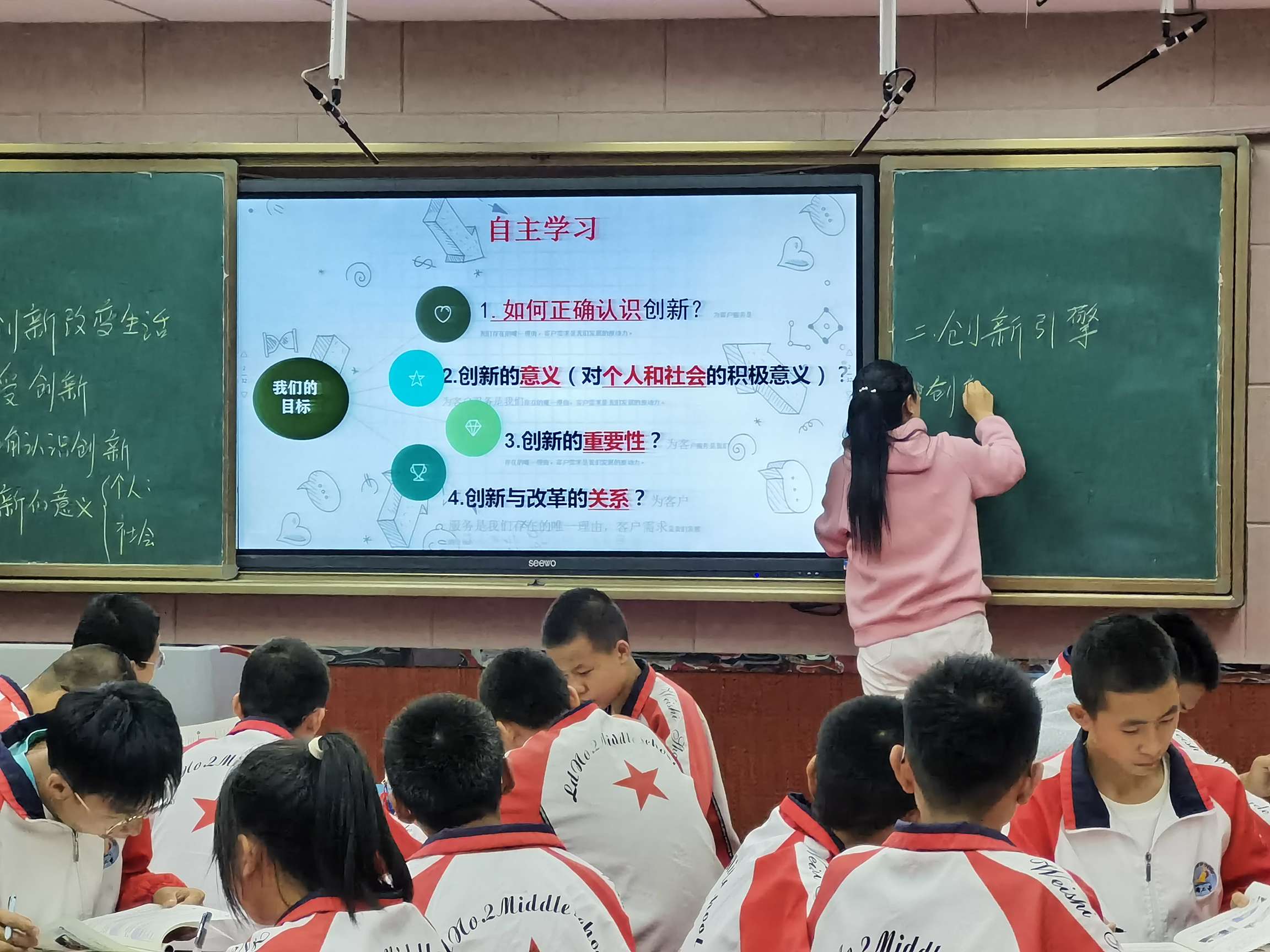 为进一步推进“双减”政策的落实,在教研中提升教师业务水平和教学能力,培养学生核心素养,更好地为初中历史、政治提质增效服务,2022年9月14日上午,隆德县第二中学政史教研组进行了教研活动,听评于娟老师的公开示范课《创新改变生活》,于老师以视频《智慧生活》和“生活中的小创意”导入,激发了学生的学习兴趣和学习热情。