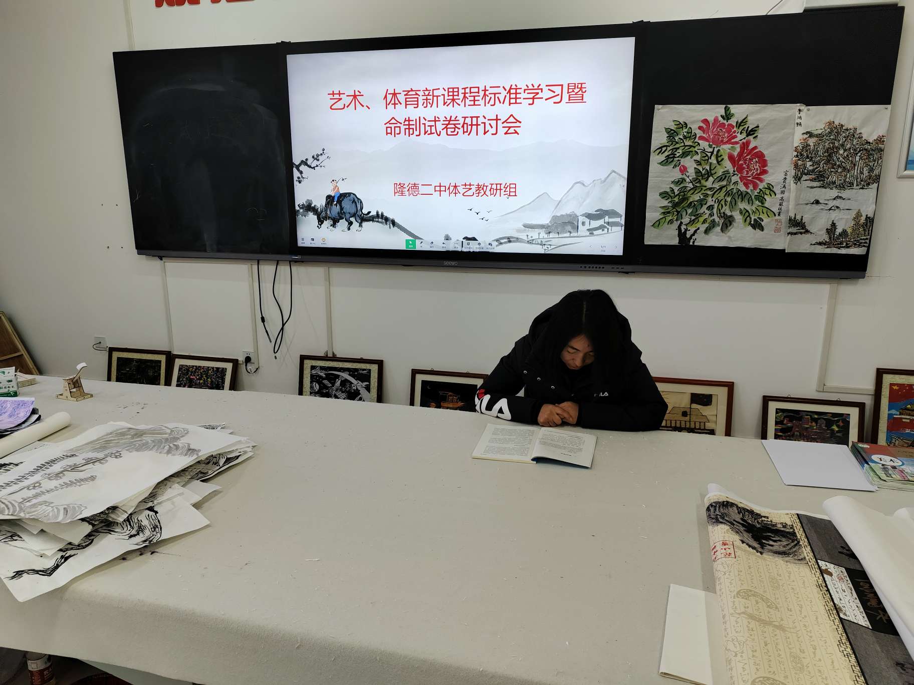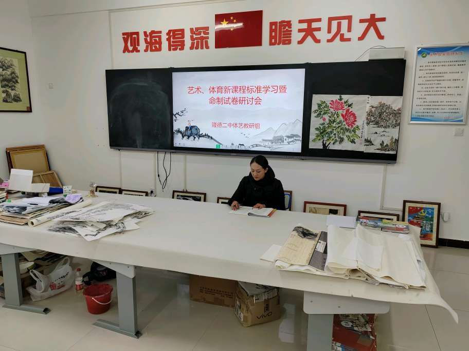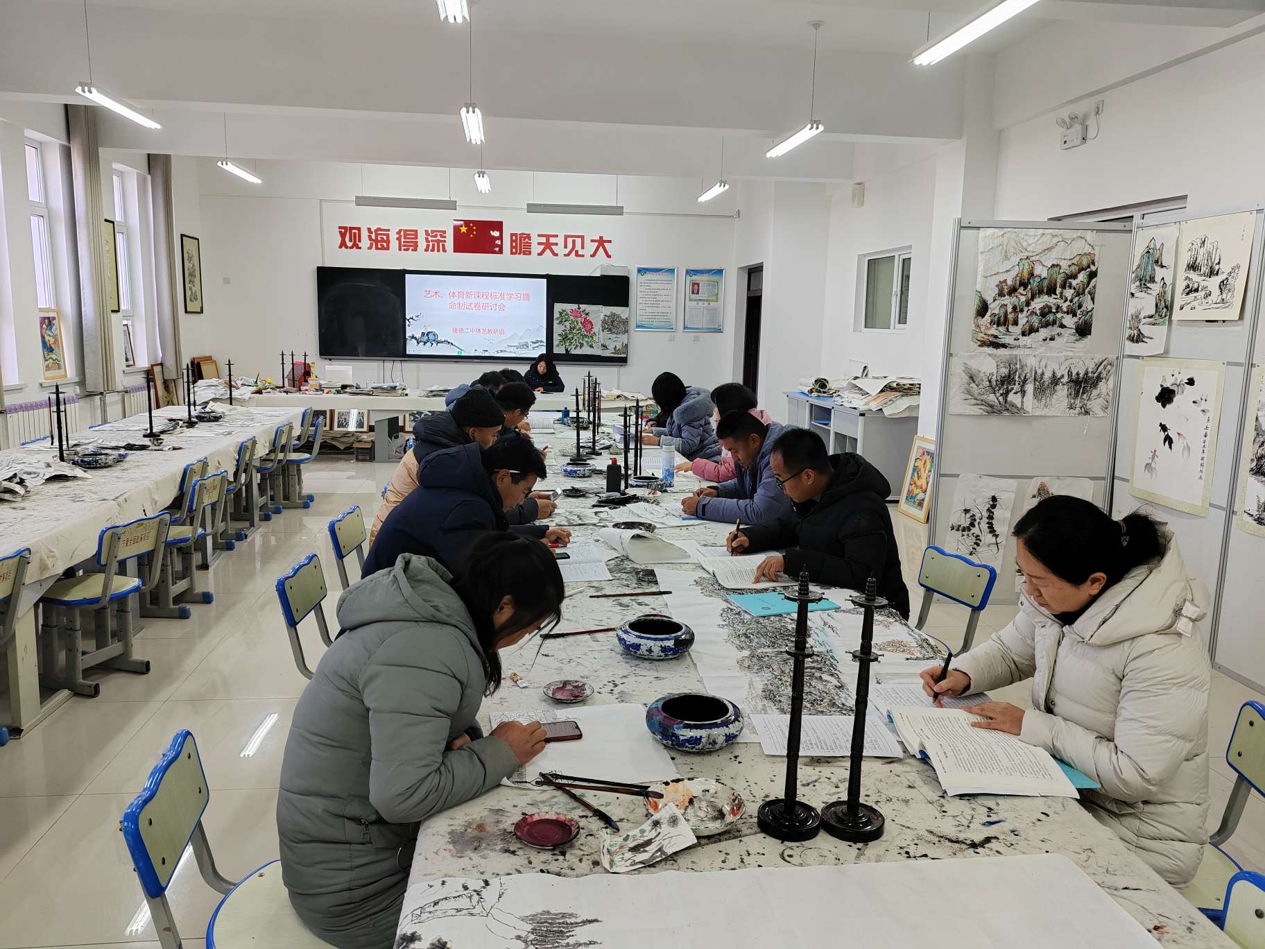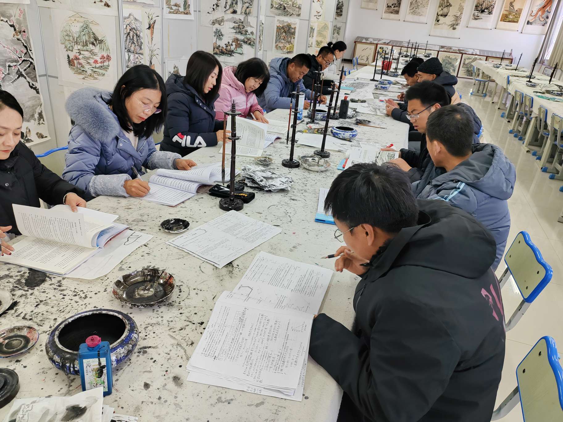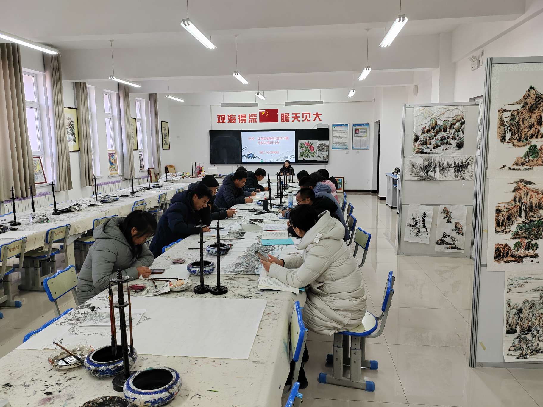 为加强对新课程标准的解读与学习,促进义务教育阶段艺术、体育教学的深度变革,全面提升艺术、体育教师的教育教学理念,促进艺术、体育教师专业化发展。2023年12月20日,全体体艺组老师在学校艺术楼国画教室进行研讨学习。