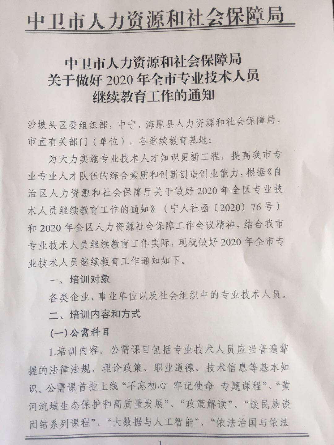 全体教师:现将《中卫市人力资源和社会保障局关于做好2020年全市专业技术人员继续教育工作的通知》转发给大家,希望全体教师按照通知要求,认真进行公需科目的学习,要求2020年11月23日前完成学习。