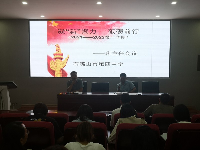 新学期、新起点、新希望。近期石嘴山市第四中学组织召开第一次班主任会议。会议围绕“凝‘新’聚力 砥砺前行”这一主题展开了研究和讨论。本次会议由陈学升校长,张雄杰副校长就各位班主任的各项工作给予了充分肯定,同时也就新学期重点工作指名方向。他们希望班主任一如既往地做好工作,把工作“抓细、抓小、抓实”,让良好的校风、学风、班风涵养四中的德行品质和精神气质。