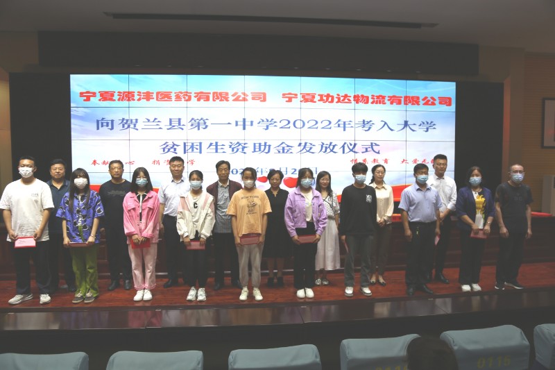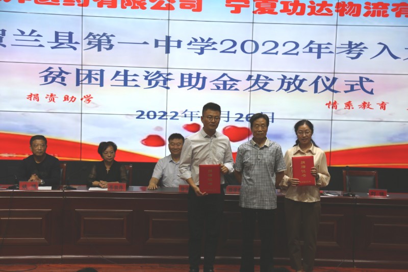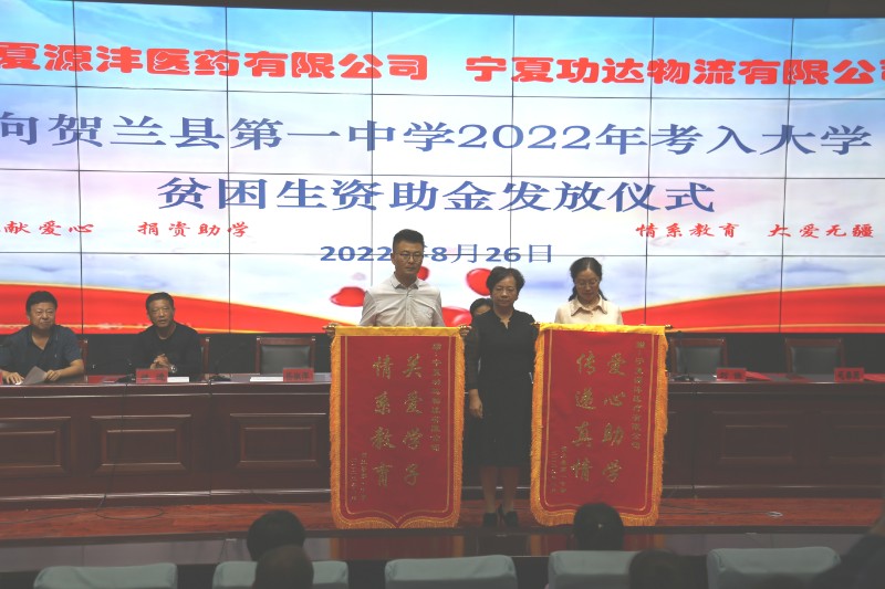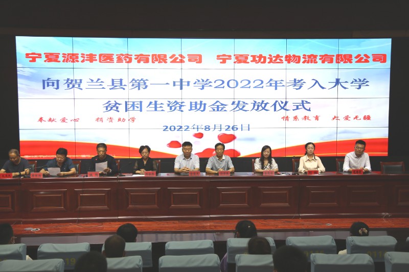 8月26日下午,宁夏源沣医药有限公司、宁夏功达物流有限公司向2022年考入大学贫困生捐资助学仪式在贺兰一中举行。贺兰县慈善总会会长任学良、贺兰县教研室主任张德华、县慈善总会监事会监事长徐海龙、宁夏源沣医药有限公司总经理刘佳、宁夏功达物流有限公司总经理毛春民及贺兰一中相关行政领导、受捐助学生参加捐资助学仪式。仪式由副校长周家驹主持。