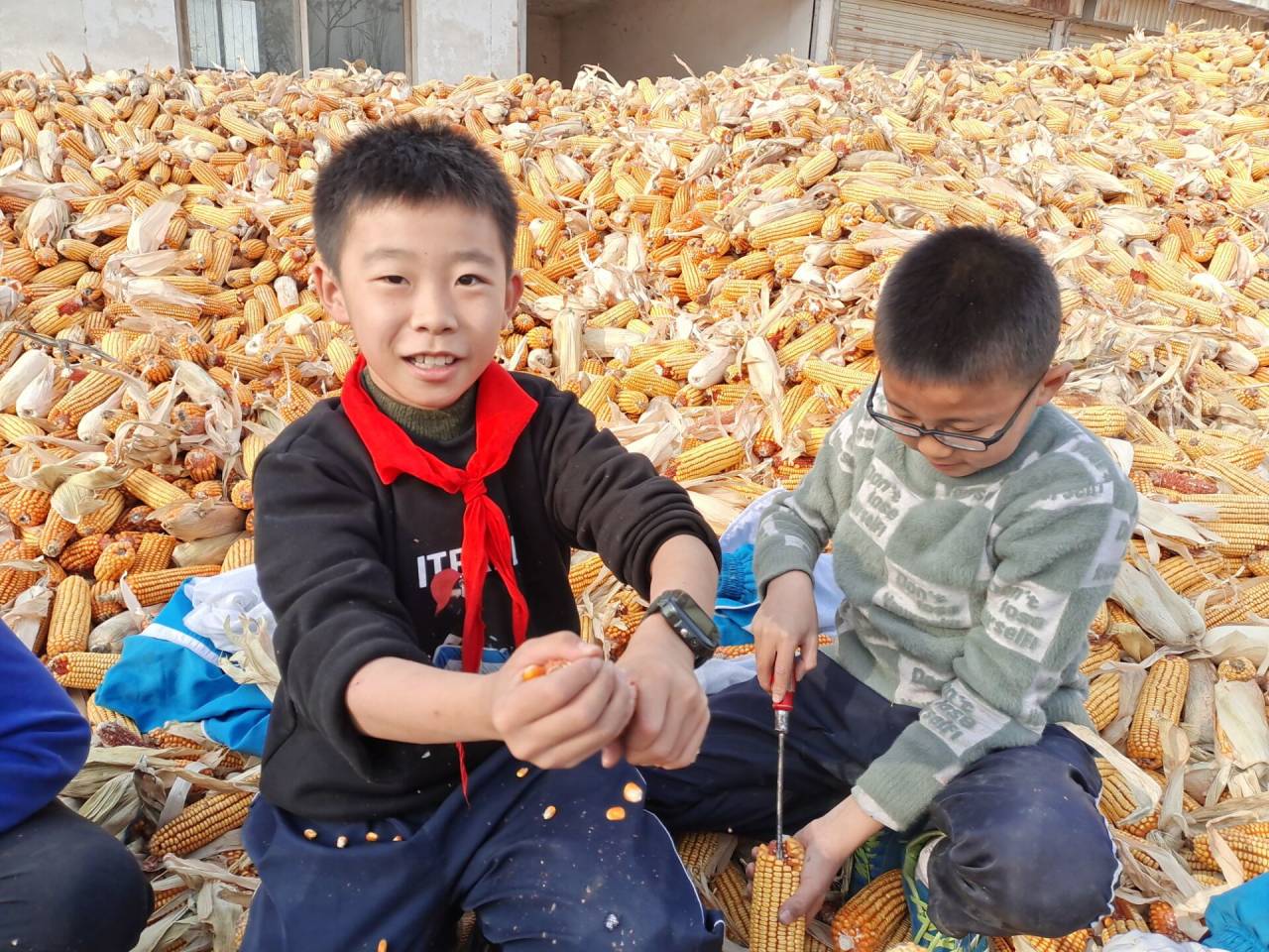 10月28日,惠农小学四、五年级学生在劳动课老师的带领下,来到下营子一队粮农大院,开展学农“搓玉米”实践活动.