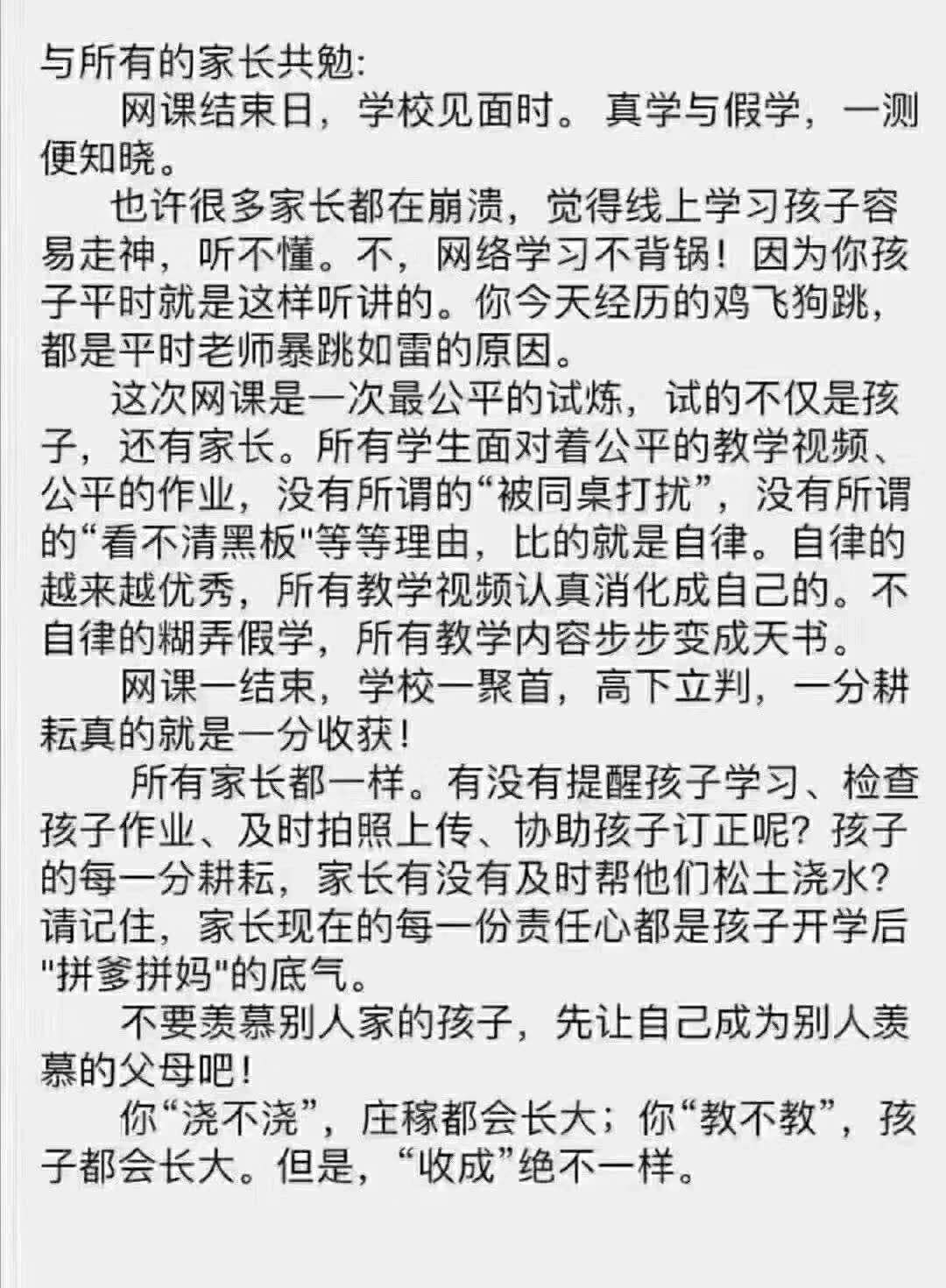 这段话不长,很多道理大家其实都懂,但这个特别的开学季,作为老师,总能在其中读出酸甜苦辣。在家上课,拼孩子的自律,更拼父母的监管力!孩子不想学就不学,那还要父母做什么?在教育孩子的时候,你选择了挣钱,不去管教孩子,等孩子大了,你辛辛苦苦挣一辈子的钱不够他败家一年;在教育孩子的时候,你选择了管教,陪伴,等孩子大了,你一辈子没挣到的钱孩子一年就挣到了。你在哪方面付出,就会在哪方面收获,孩子的教育时效性太短,错过了就再也没有了!孩子,上网课很累、很苦,但是别忘了那些为了给你上网课辛苦备课的老师,别忘了父母为了让你安心上课在背后付出了很多努力!如果你不爱学习,现实的生活会诚实地告诉你们:不学习的人生会更苦!对你要求严厉的老师,你不要心生敌意,反而要心怀感激。因为,只有负责的老师才会顶着种种压力和风险,去苦口婆心或大动干戈地管教你。他期待你成才变好,才如此出力不讨好。这是传道授业的悖论,也是为人师者的深情。只有负责的老师才管学生!不指望每个学生都懂这个道理,因为他们毕竟还只是个孩子~但是希望每个家长都懂这个道理,因为你们毕竟不是孩子了!还要告诉孩子,在成长过程中遇到负责、公正、认真的老师是多么值得庆幸的事情啊!当老师的你,生命中会遇到很多个学生,每一个学生对你而言,只不过是众多学生中的一个。然而,对于学生来说,你却是他生命中遇到的有限的老师。你将是开启他万千世界的人,若爱,请深爱;若教,请全力以赴。