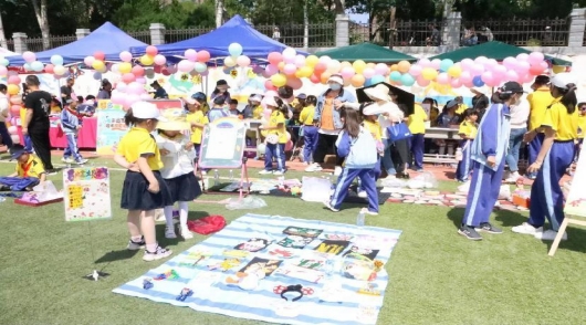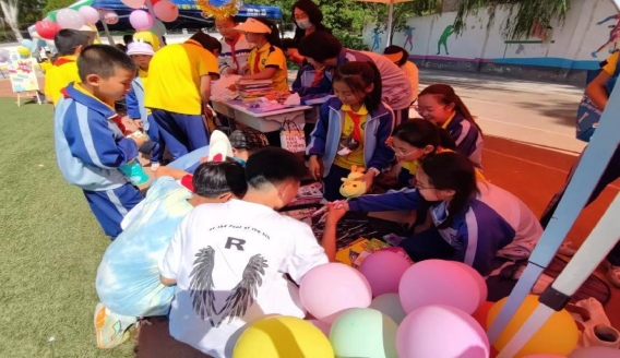 要开始摆摊儿啦!学生们一个个变身“小老板”,精心的布置着自己的小摊位。不一会活动现场摆满了大大小小的摊位,儿童读物、益智玩具、手工作品等各种闲置商品琳琅满目。