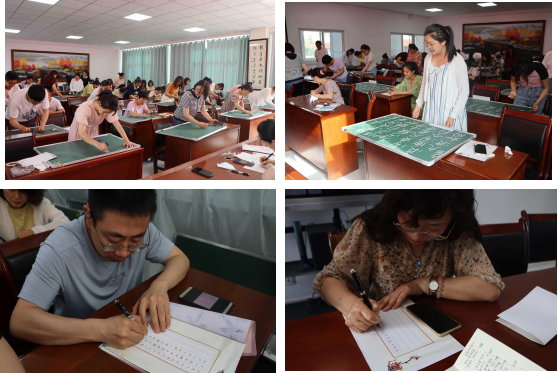 本次“三笔字”比赛项目为毛笔字、钢笔字和粉笔字。参赛对象为全体教师。为使此项活动真实有效,采用现场书写的形式,并要求参赛教师在规定时间内完成指定书写内容。教师们都拿出了自己的看家本领,认真严谨,一笔一划地书写,整个比赛精彩纷呈。