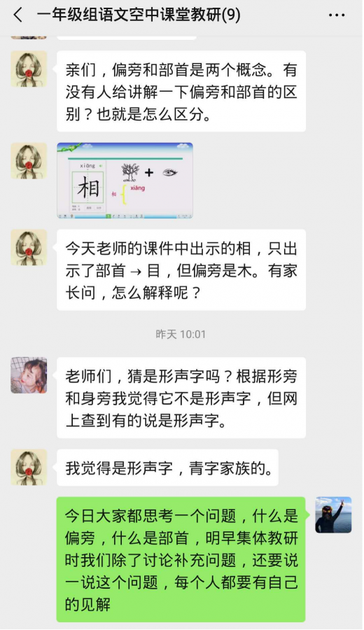 一(1)班刘楠老师提出了自己班的在线答疑方法。她们班采用的是统一说重点,单个指出问题,还有统一评价整体作业的方式,学生易于接受。刘楠老师提出开始让学生练习写话,如何让学生写出真情实感值得我们所有老师去思考。
