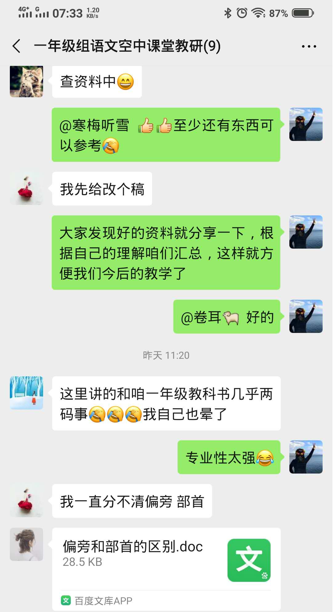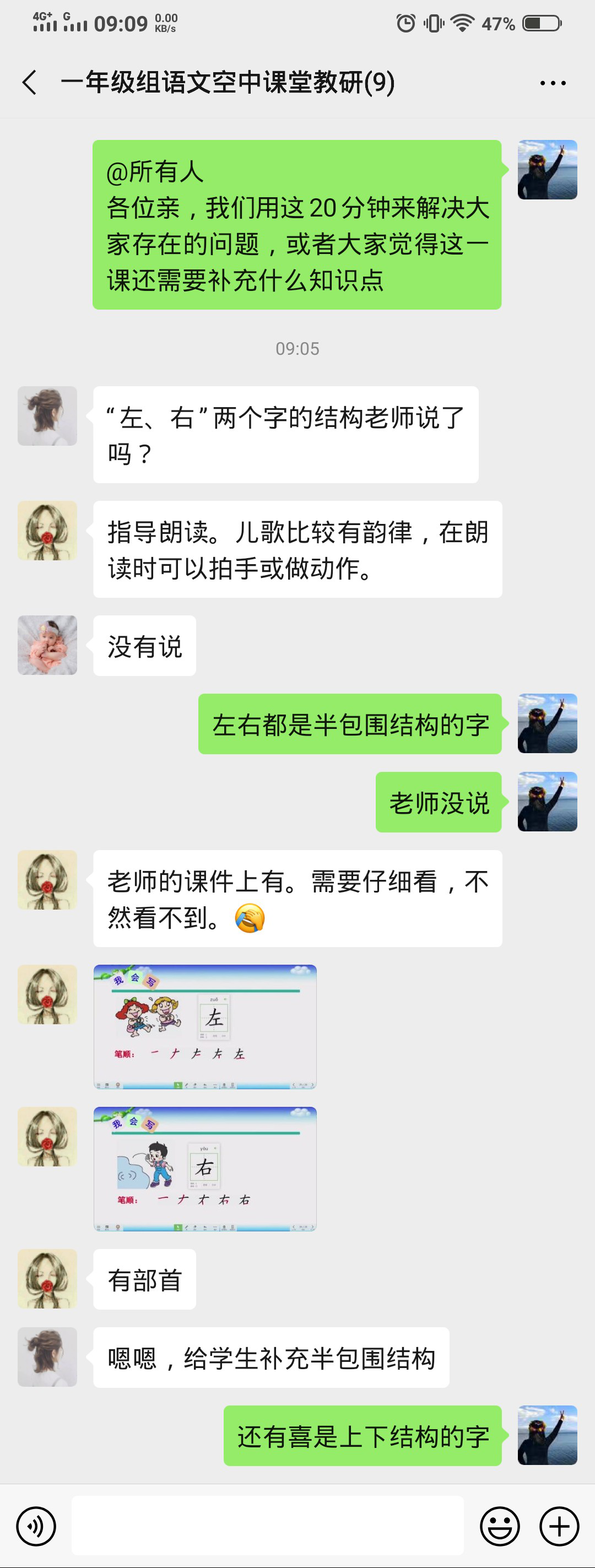 一(7)、(8)班的李冬梅老师和薛老师就如何区分生字的结构提出了自己的疑问。因为现在的教材有所调动,很多我们小时候学是字词在结构和部首上都发生了变化,为了给孩子们准确的知识,我们必须先自己查阅资料。目前疫情当前,没办法做到人手一本教参,大家只能通过网络教参来备课,可是有些教参却是盗版,让教师也陷入了误区,这时候我们就需要通过集体的智慧,找到统一的答案再传授给学生。