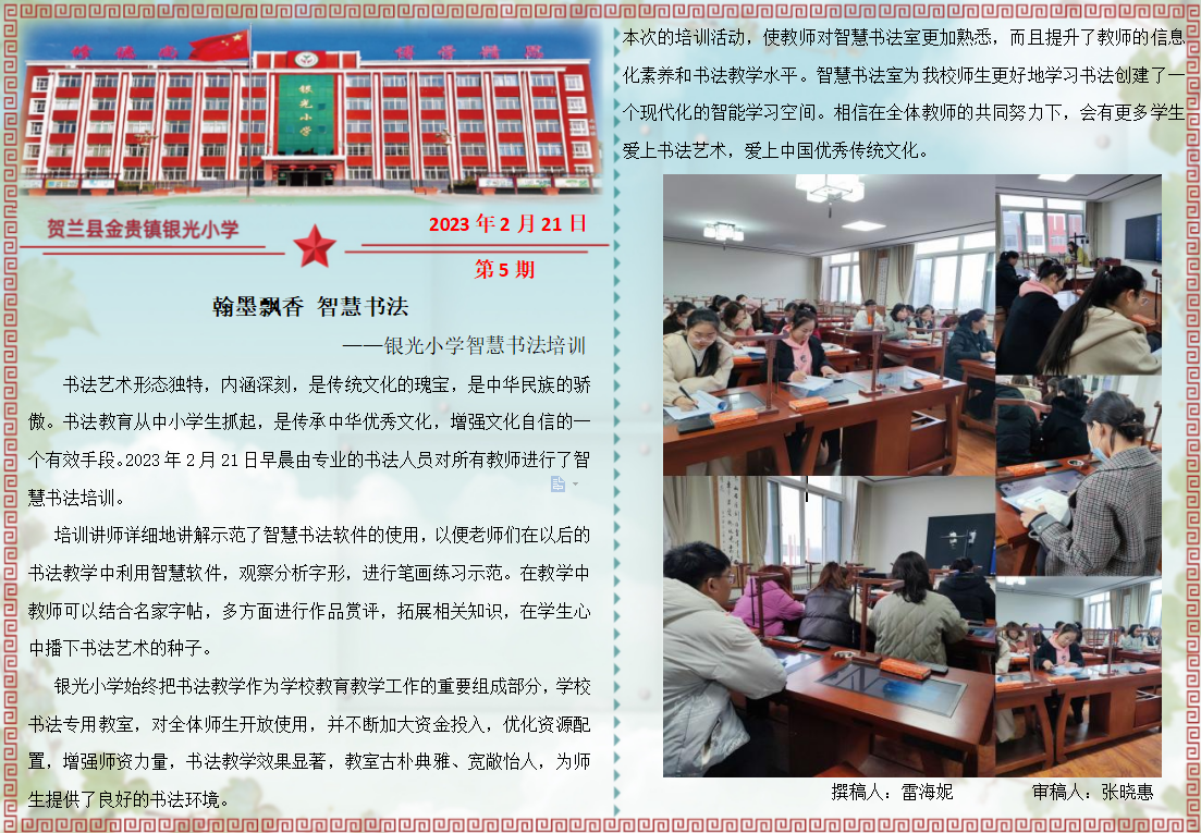 书法艺术形态独特,内涵深刻,是传统文化的瑰宝,是中华民族的骄傲。书法教育从中小学生抓起,是传承中华优秀文化,增强文化自信的一个有效手段。2023年2月21日早晨由专业的书法人员对所有教师进行了智慧书法培训。