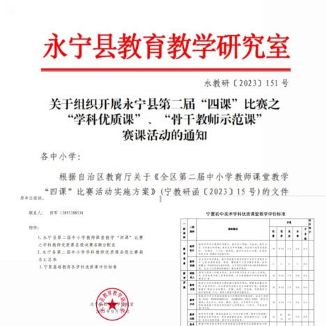 根据自治区教育厅关于《全区第二届中小学教师课堂教学“四课”比赛活动实施方案》,永宁县组织开展全县第二届中小学课堂教学四课比赛“优质课”活动,闽宁中学现进行校内评比活动。美术组由赵伟、杨睿舒老师参加比赛活动。