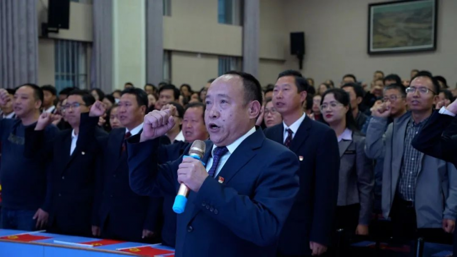 大会第二项,西吉中学党委书记、校长郭占荣带领全体教师庄严宣誓,不忘教育初心,坚定教育使命。