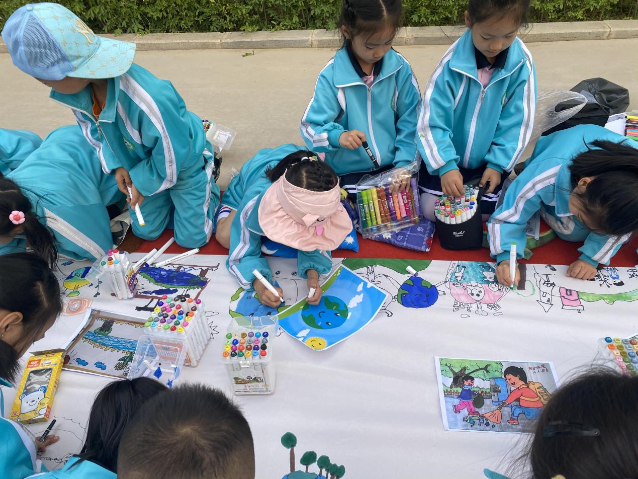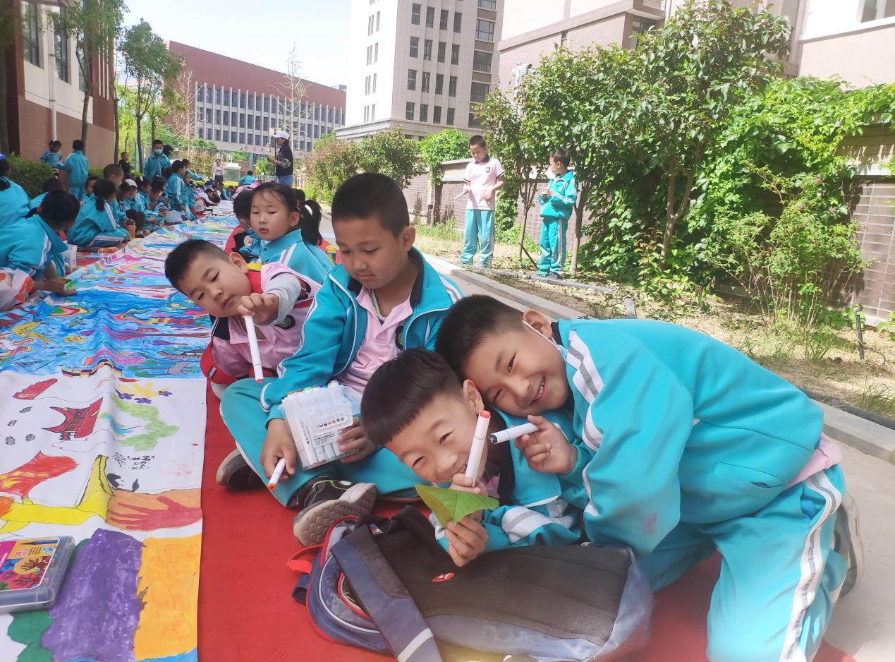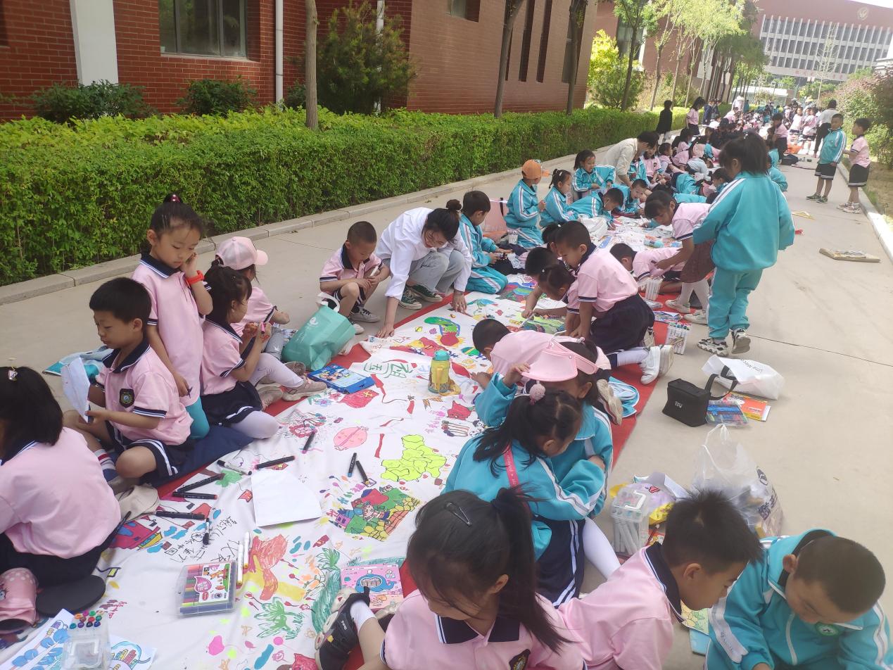 鲜艳的五星红旗、飞驰的高铁、漫步太空的宇航员、幸福美好的校园生活等等,在活动中,学生们或趴、或跪、或蹲,神情专注而认真,画笔飞扬而多彩,老师们也积极的参与其中指导、共创,欢声笑语与美好的画面交织在校园跑道上。