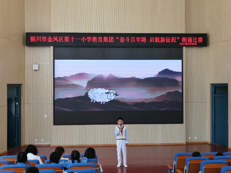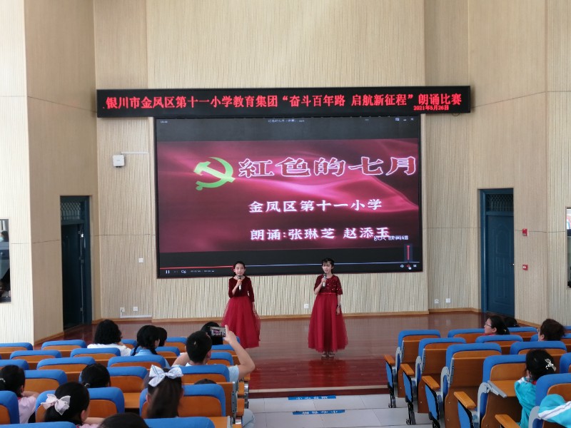 活动在徐子涵、王萧和同学的主持下拉开了帷幕,首先,进行了个人朗诵比赛,金凤十一小、金凤十二小和润丰小学经过评选共推送了6个个人朗诵作品,100年的历史沧桑,100年的风雨激荡,100年的波澜壮阔,100年的壮丽辉煌,孩子们用声音表达着对党和祖国的热爱。接着进行的是集体朗诵比赛,爱国是一个永恒的主题,每一个中华儿女心中都充满了对祖国无尽的爱,孩子们激情昂扬诵经典,充分抒发了爱党爱国的深厚情感。十一个节目内容丰富,形式多样。台下的聆听者们通过孩子的表达看到了峥嵘岁月里为了理想拼搏奋斗的先烈们,看到了继承开拓者们精神的少年目标,更看到了建党百年来新农村的变化以及孩子们眼中那个如母亲般慈祥伟大的祖国。学生们声音洪亮、情感丰沛,赢得了台下观众的阵阵掌声。