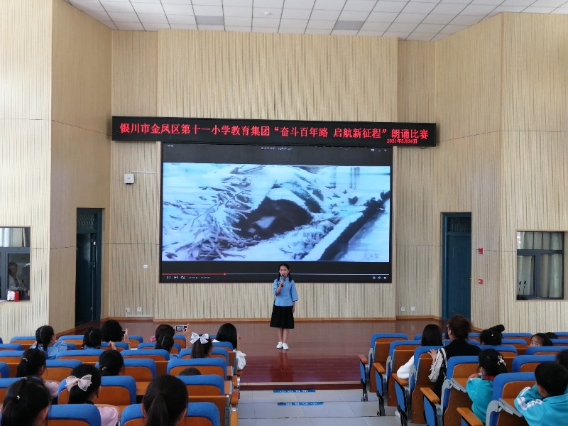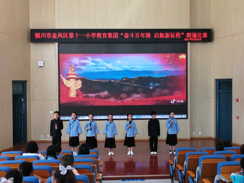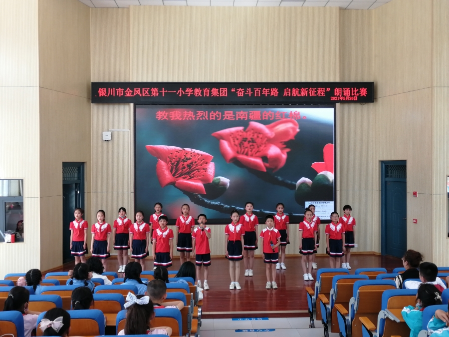 为迎接中国共产党建党100周年华诞,倡导传承红色文化,铭记革命精神,激发同学们的民族自豪感和爱国精神,促进集团校之间的交流、学习。2021年5月26日,银川市金凤区第十一小学教育集团在金凤十二小开展了已“奋斗百年路,起航新征程”为主题的朗诵比赛。
