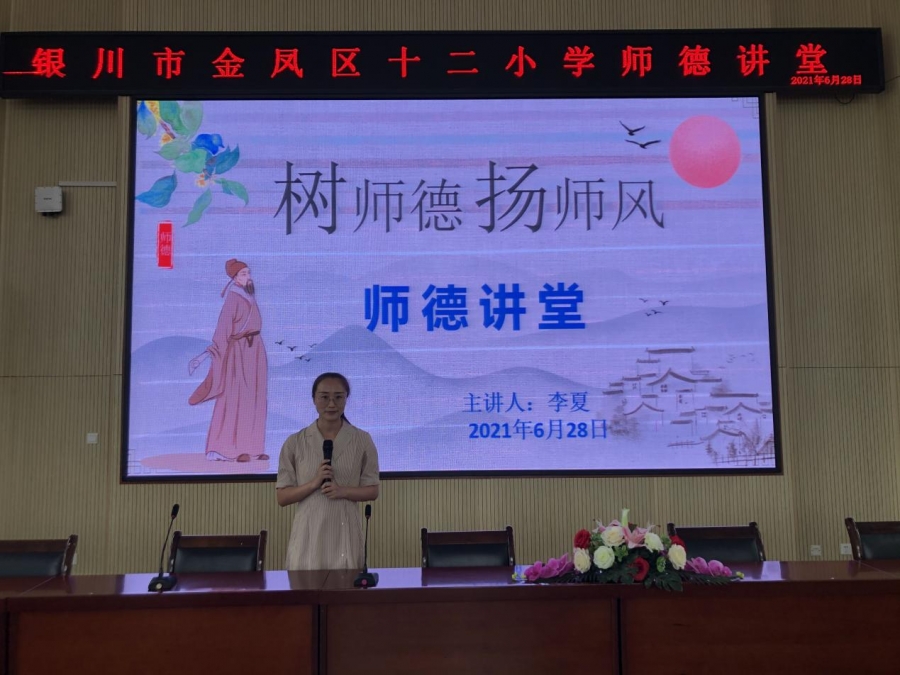 为深入贯彻习近平总书记关于师德师风建设的重要思想,认真落实中共中央关于全面深化新时代教师队伍建设的意见,把师德建设摆在突出重要的位置,把师德师风作为评价教师素质的第一标准,营造“风清气正、尊师重教”的浓厚学校氛围。金凤区第十二小学党支部与6月28日下午在阶梯教室开展了“树师德 扬师风”师德讲堂活动,此次师德讲堂活动由李夏老师主讲,全体教师参加。