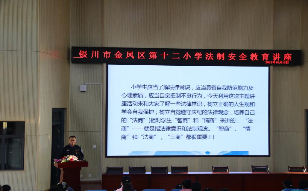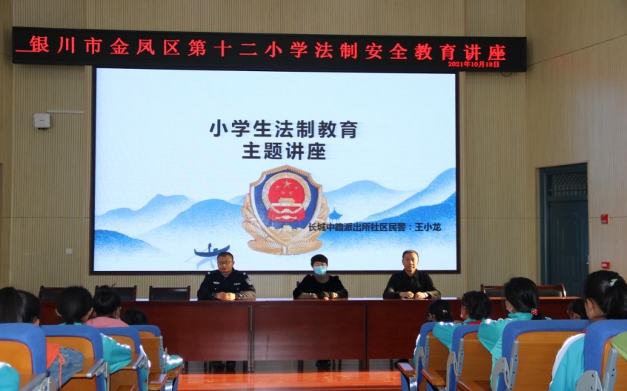 俗话说:“生活多彩,规矩要在;逍遥自在,先得守法;是非纷争,法律为准;法制社会,你我同卫。”为增强学生的法制观念,提高学生的法制意识和自我保护意识,营造校园文明、平安、和谐的育人环境,2021年10月18日上午,银川市金凤区第十二小学邀请了长城中路派出所社区民警王小龙警官,在阶梯教室为全校师生开展了一场生动的法制教育主题讲座。
