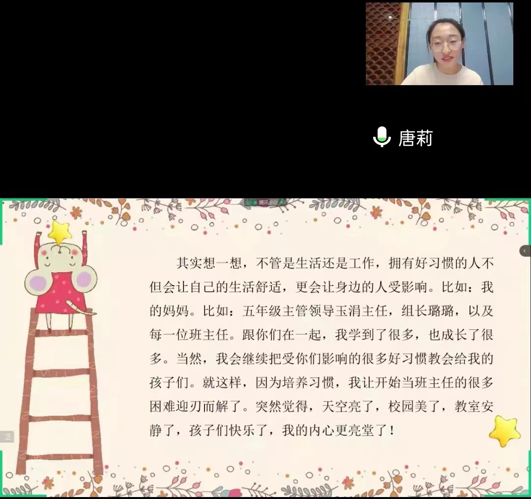 接下来,由唐莉老师分享教学故事《一段心路历程》,唐老师讲述了初次当班主任的心路历程。她从最初的焦虑中发现存在的问题,思考后开始培养孩子们的习惯,慢慢地解决了当班主任时的困惑,班主任工作也处理得游刃有余。虽然过程很艰辛,但收获却是满满的。萨克雷先生说:“播种行为,能够收获习惯;播种习惯,能够收获性格;播种性格,能够收获命运”。唐老师用心爱孩子,用行动培养习惯,对全班学生制定了奖励机制,让每一个孩子都学习快乐、快乐学习,她用诚和爱走出了属于自己的教学之路,用人格的魅力,在学生心中形成了一个美丽的光环。