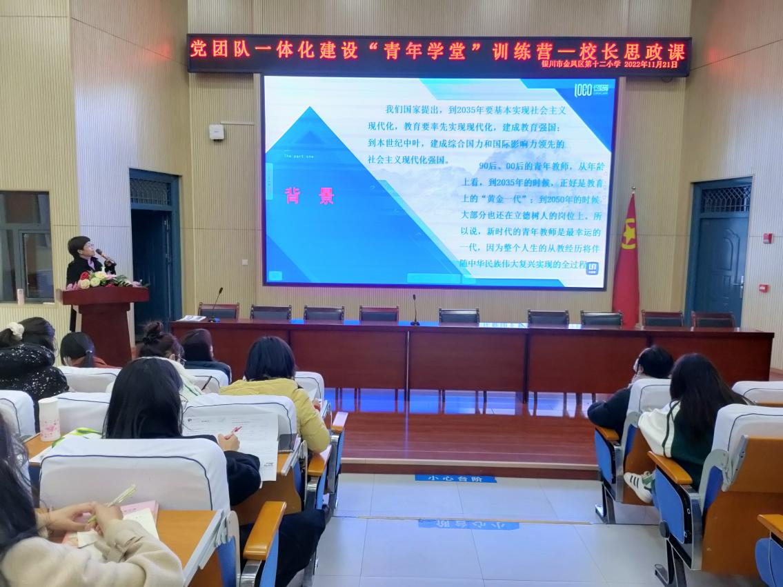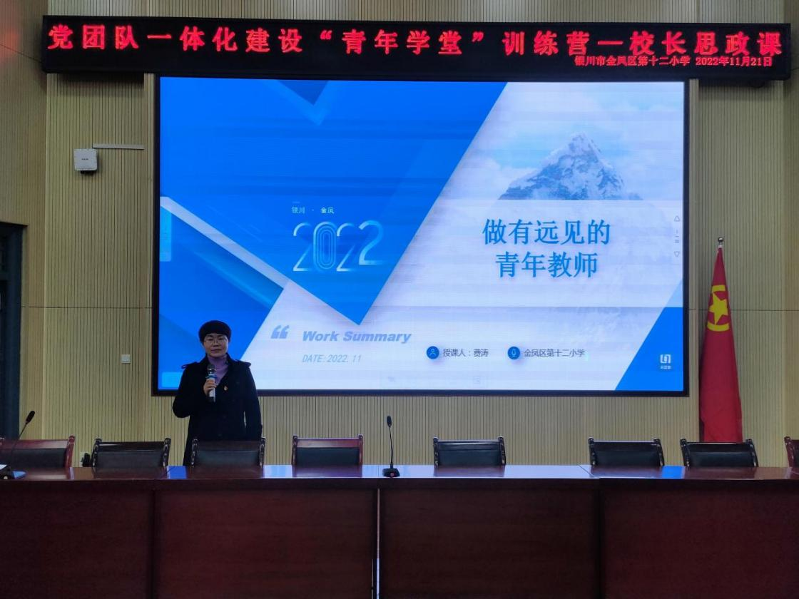 “新时代的青年教师是最幸运的一代,因为整个人生的从教经历将伴随中华民族伟大复兴实现的全过程。青年教师将发挥至关重要的作用,承担培养时代新人的重任,志存高远,过一种不一样的教育生活。”伴随着一声殷切的叮嘱,2022年11月21日下午,银川市金凤区第十二小学费涛校长为金凤十二小全体教职工上了一堂以《做有远见的青年教师》为主题的校长思政课。引领青年教师树立高远目标,有意义地前行,始终做有远见的人。