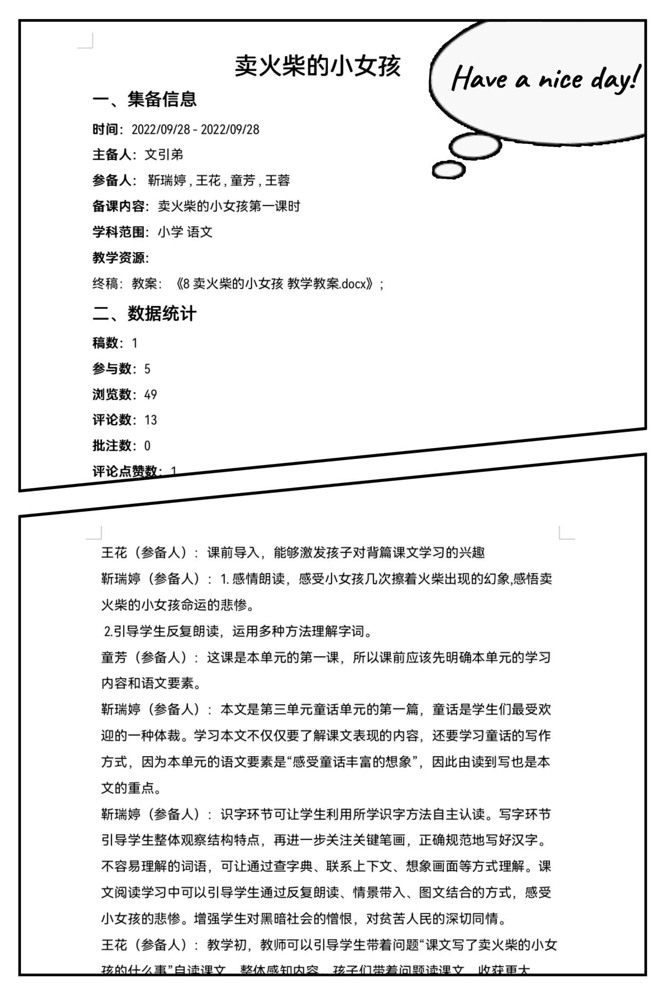 下午,三年级组语文教师共同探讨了第三单元《童话世界》如何实施更好教学。首先,王花老师对本单元的课标、教学目标、教学重难点、学情等进行了深入地分析;其次文引弟老师就本单元中《卖火柴的小女孩》一课为大家讲述了自己的教学思路;最后靳瑞婷老师和童芳老师交流道:本单元是童话单元,学习本单元不仅要了解课文表现的内容,还要学习童话的写作方式。此次线上研讨交流,每位老师都受益匪浅,收获良多!